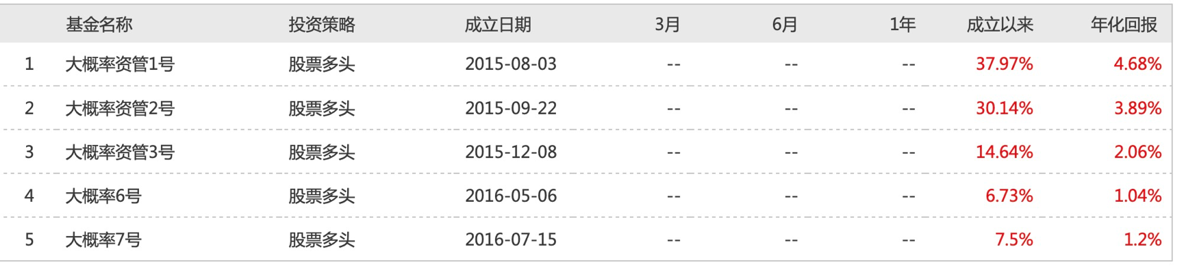对于这家深圳私募,很多人可能并不熟悉。根据Wind数据,目前大概率资产旗下仅杨济源1名基金经理,管理5只私募基金产品,分别为大概率资管1号、2号、3号,大概率6号、7号,均为股票多头策略。从收益率来看,成立以来均为正回报,其中大概率资管1号自2015年8月成立以来,取得37.97%的收益率。大概率7号表现相对较差,成立4年以来回报率仅为7.5%。