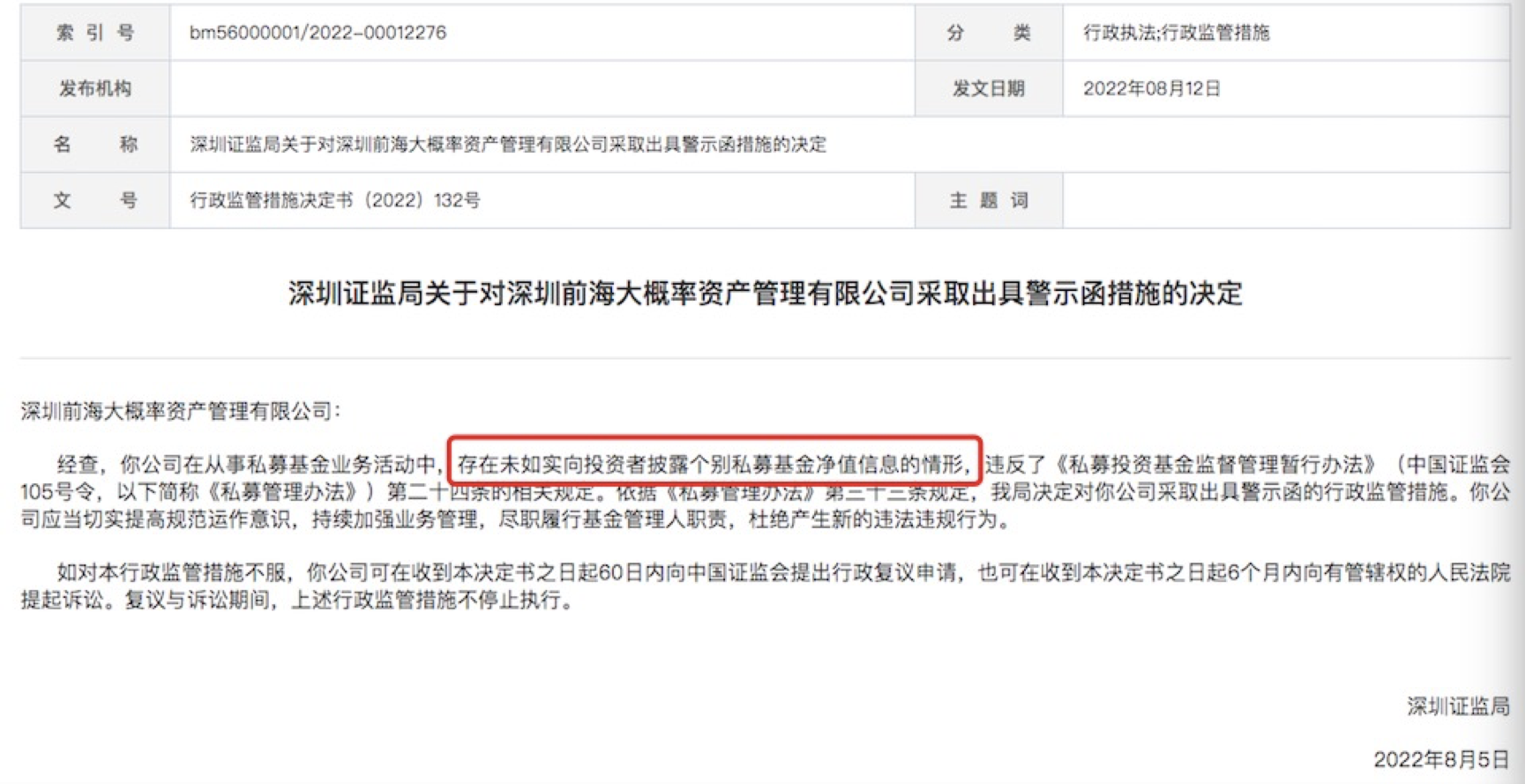 8月12日,深圳证监局发布两则监管措施,对深圳前海大概率资产管理公司以及公司创始人杨济源采取出具警示函的决定。对于处罚原因,创始人杨济源向记者表示,“因2016年熔断,两个月没有及时发送净值信息,客户因为(净值)落差太大进行了投诉。”