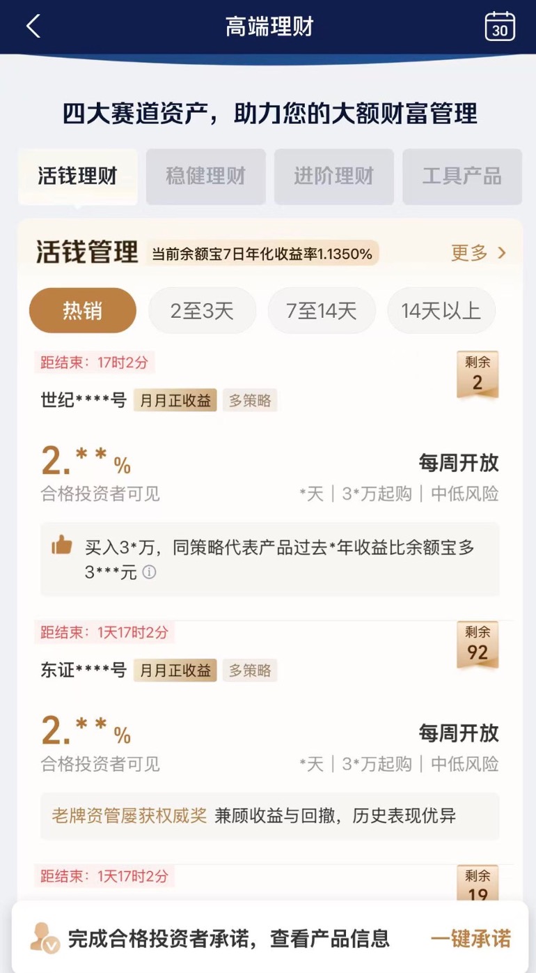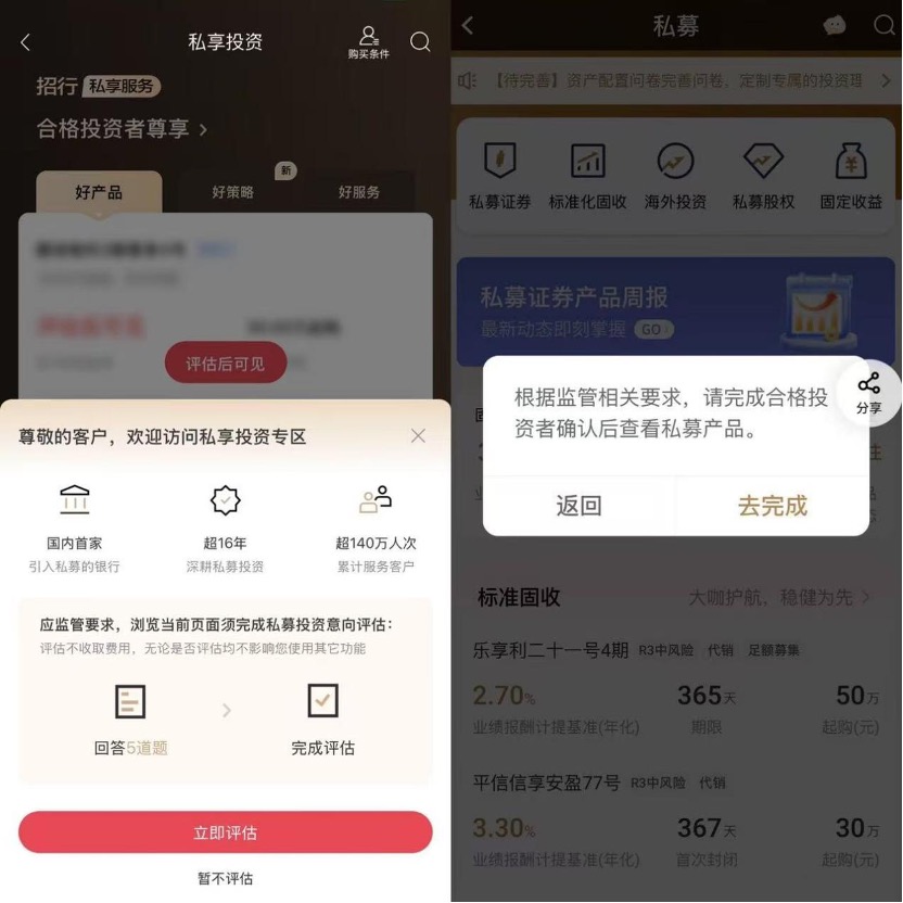 银行松紧有别。多数银行在私募、私享理财专区的首页有“合格投资者认证”的强制弹窗,但是弹窗之下则松紧有别,有的银行在净值展示区显示“评估后方可查看”,有的银行则直接展示部分首页产品的业绩。