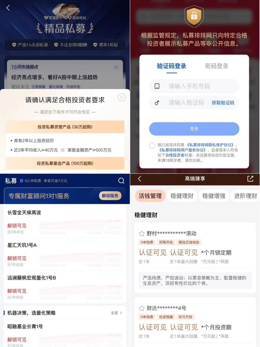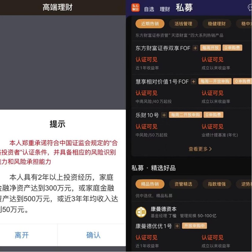 券商在私募代销合规性较强。多家私募在进入“高端理财”“私募专区”页面时,合格投资者认定弹窗是必选项,如不认证则直接跳出相关专区页面。