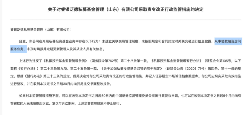 睿银泛德的多项违规既暴露信披等内控缺失,处罚核心还指向该私募从事借款融资居间服务业务,直接违反了私募基金管理人的专业化经营原则。作为一家私募基金管理人,睿银泛德未能履行其“受人之托,代人理财”的根本职责,反而从事着与资产管理本质无关的“资金掮客”业务。