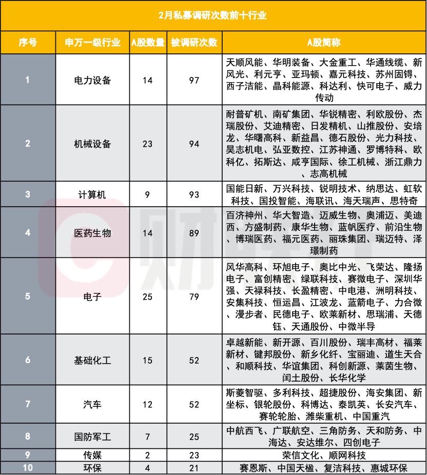 将视角进一步放大到行业层面,2月共有13个申万一级行业被私募调研次数不少于10次,其中8个行业调研次数在50次以上。电力设备行业是当月最受关注的板块之一,共有14只个股进入调研名单,合计调研次数达到97次,天顺风能、华明装备、大金重工、华通线缆等公司均被调研不少于10次。