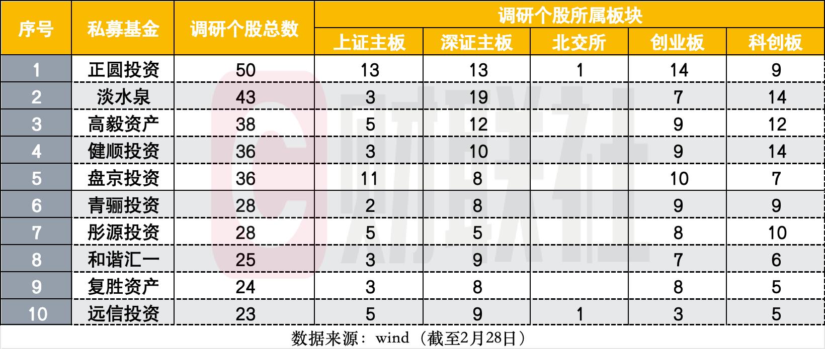 据Wind统计,截至2月28日,私募开年以来调研总次数、调研个股总数前十名,均为同一批私募,仅第九、第十名排名有异。经查,私募调研前十名中百亿私募共计6家,包括淡水泉、高毅资产、盘京投资、和谐汇一、复胜资产、远信投资。