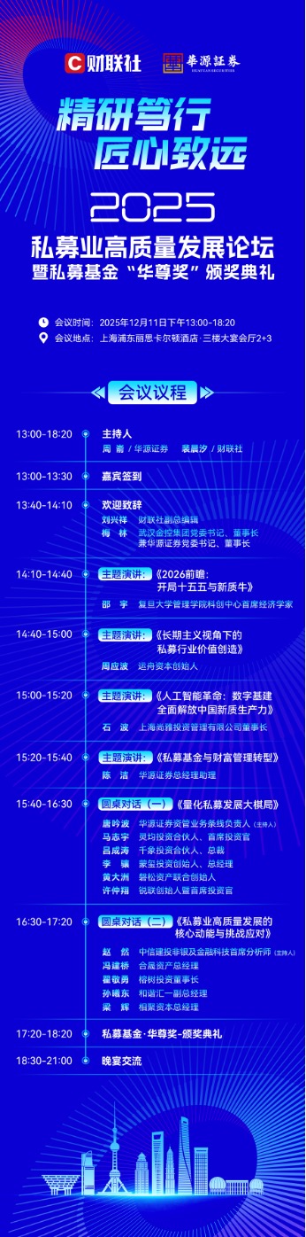金融改革持续深化、资管行业加速转型的当下,由与华源证券联合主办、东吴证券协办的首届私募业高质量发展论坛将于12月11日在上海隆重举行,百余家私募共聚,闭门私享会与主论坛呼应。备受瞩目的首届私募“华尊奖”颁奖典礼将盛大揭晓,为这场年度思想盛宴增添荣耀注脚。