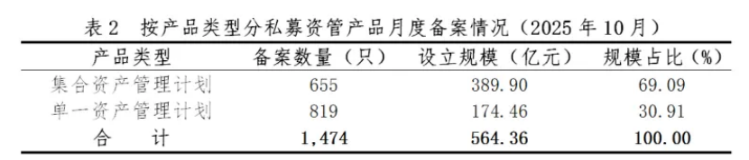 今年10月,证券期货经营机构共备案私募资管产品1474只,环比下降36.05%,同比增加209.01%;设立规模564.36亿元,环比下降32.12%,同比增加73.92%。9月,私募资管产品备案2305只,设立规模831.47亿元。