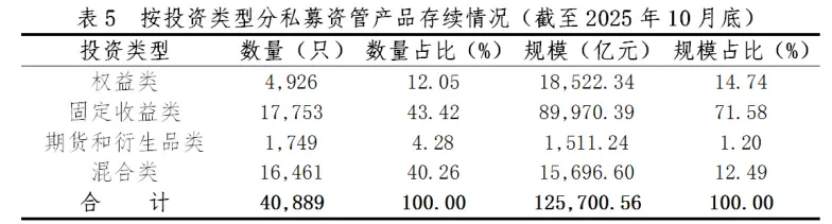 具体来看,混合类产品、固定收益类产品、期货和衍生品类产品、权益类产品,今年10月分别备案了818只、465只、102只、89只,设立规模依次为193.8亿元、259.92亿元、84.14亿元、26.5亿元,规模占比分别为46.06%、34.34%、14.91%、4.7%。
