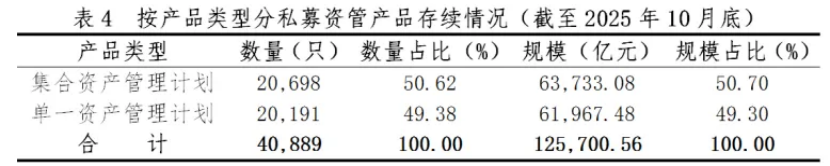 具体来看,截至10月底,集合资管计划、单一资管计划数量分别为20698只、20191只,数量占比分别为50.62%、49.38%;这2类产品的规模分别为6.37万亿元、6.2万亿元,规模占比分别为50.7%、49.3%。