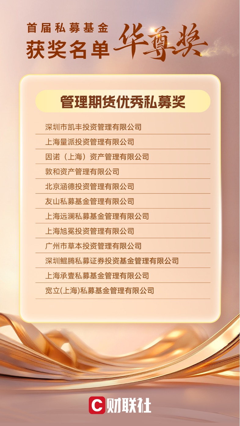 管理期货优秀私募奖:深圳市凯丰投资管理有限公司、上海量派投资管理有限公司、因诺(上海)资产管理有限公司、敦和资产管理有限公司、北京涵德投资管理有限公司、友山私募基金管理有限公司、上海远澜私募基金管理有限公司、上海旭冕投资管理有限公司、广州市草本投资管理有限公司、深圳鲲腾私募证券投资基金管理有限公司、上海承壹私募基金管理有限公司、宽立(上海)私募基金管理有限公司。