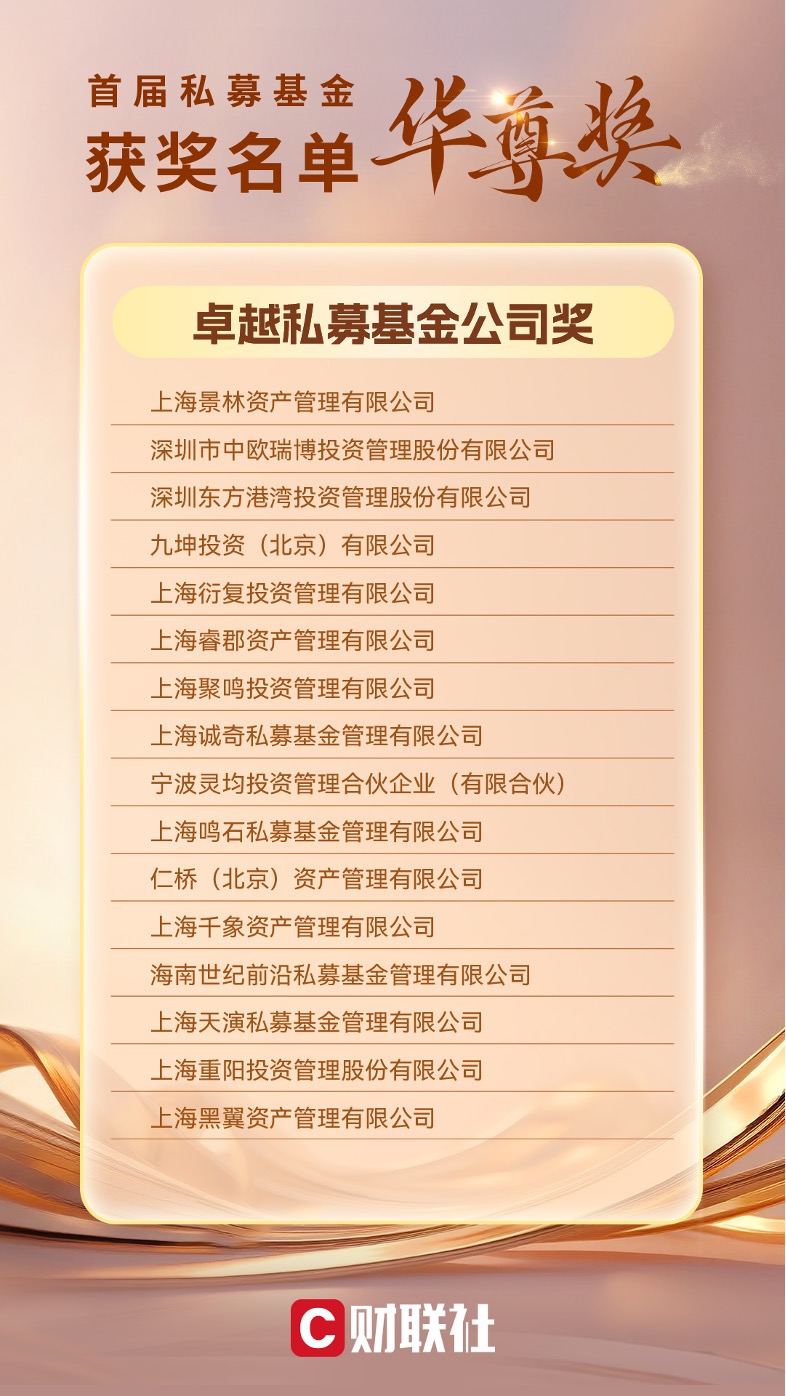 卓越私募基金公司奖:上海景林资产管理有限公司、深圳市中欧瑞博投资管理股份有限公司、深圳东方港湾投资管理股份有限公司、九坤投资(北京)有限公司、上海衍复投资管理有限公司、上海睿郡资产管理有限公司、上海聚鸣投资管理有限公司、上海诚奇私募基金管理有限公司、宁波灵均投资管理合伙企业(有限合伙)、上海鸣石私募基金管理有限公司、仁桥(北京)资产管理有限公司、上海千象资产管理有限公司、海南世纪前沿私募基金管理有限公司、上海天演私募基金管理有限公司、上海重阳投资管理股份有限公司、上海黑翼资产管理有限公司。