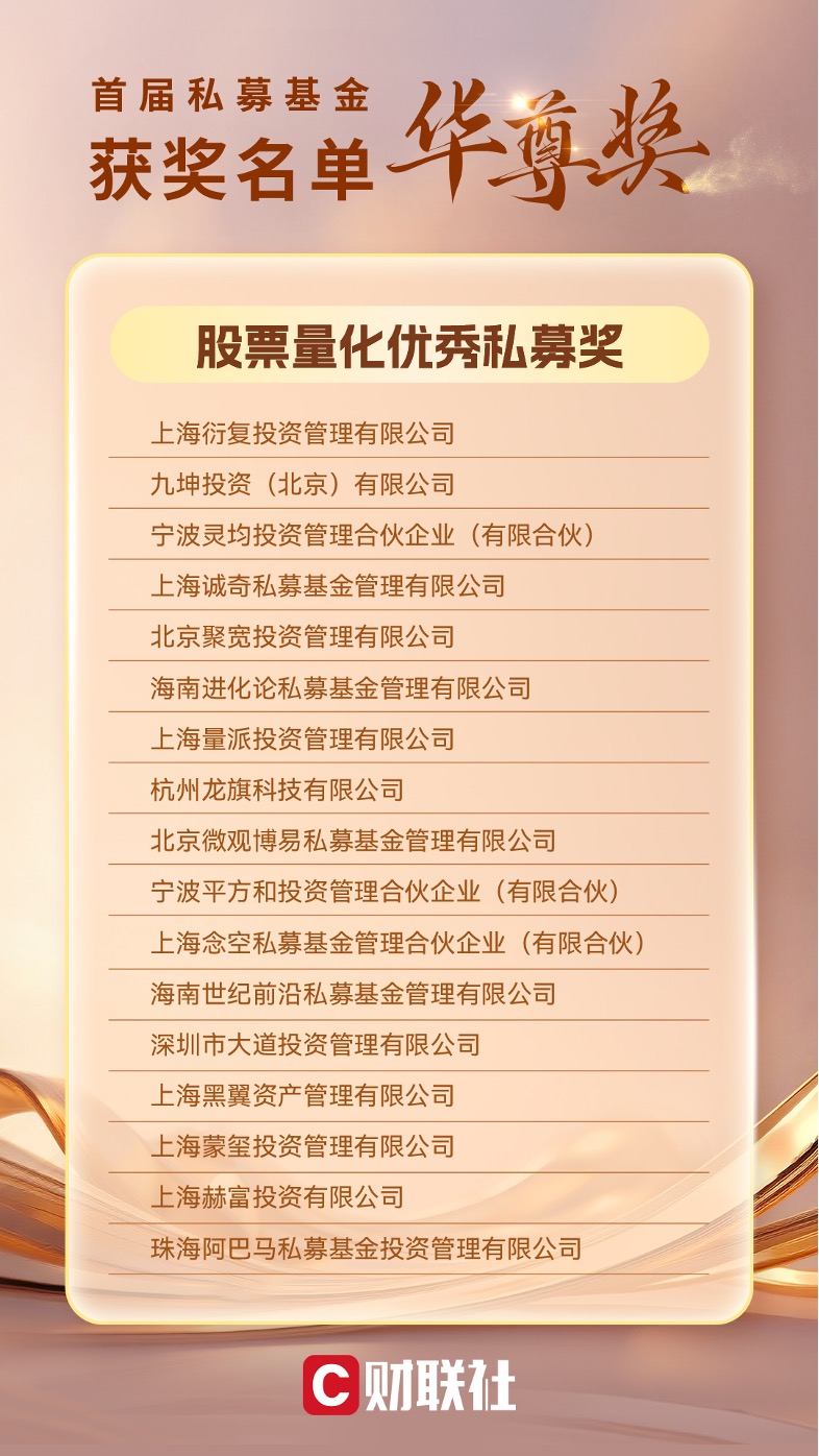 股票量化优秀私募奖:上海衍复投资管理有限公司、九坤投资(北京)有限公司、宁波灵均投资管理合伙企业(有限合伙)、上海诚奇私募基金管理有限公司、北京聚宽投资管理有限公司、海南进化论私募基金管理有限公司、上海量派投资管理有限公司、杭州龙旗科技有限公司、北京微观博易私募基金管理有限公司、宁波平方和投资管理合伙企业(有限合伙)、上海念空私募基金管理合伙企业(有限合伙)、海南世纪前沿私募基金管理有限公司、深圳市大道投资管理有限公司、上海黑翼资产管理有限公司、上海蒙玺投资管理有限公司、上海赫富投资有限公司、珠海阿巴马私募基金投资管理有限公司。
