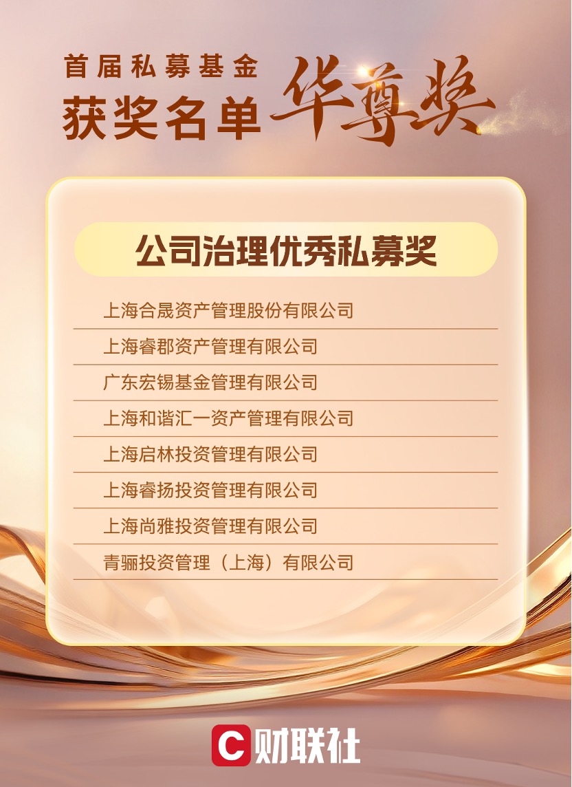 公司治理优秀私募奖:上海合晟资产管理股份有限公司、上海睿郡资产管理有限公司、广东宏锡基金管理有限公司、上海和谐汇一资产管理有限公司、上海启林投资管理有限公司、上海睿扬投资管理有限公司、上海尚雅投资管理有限公司、青骊投资管理(上海)有限公司。