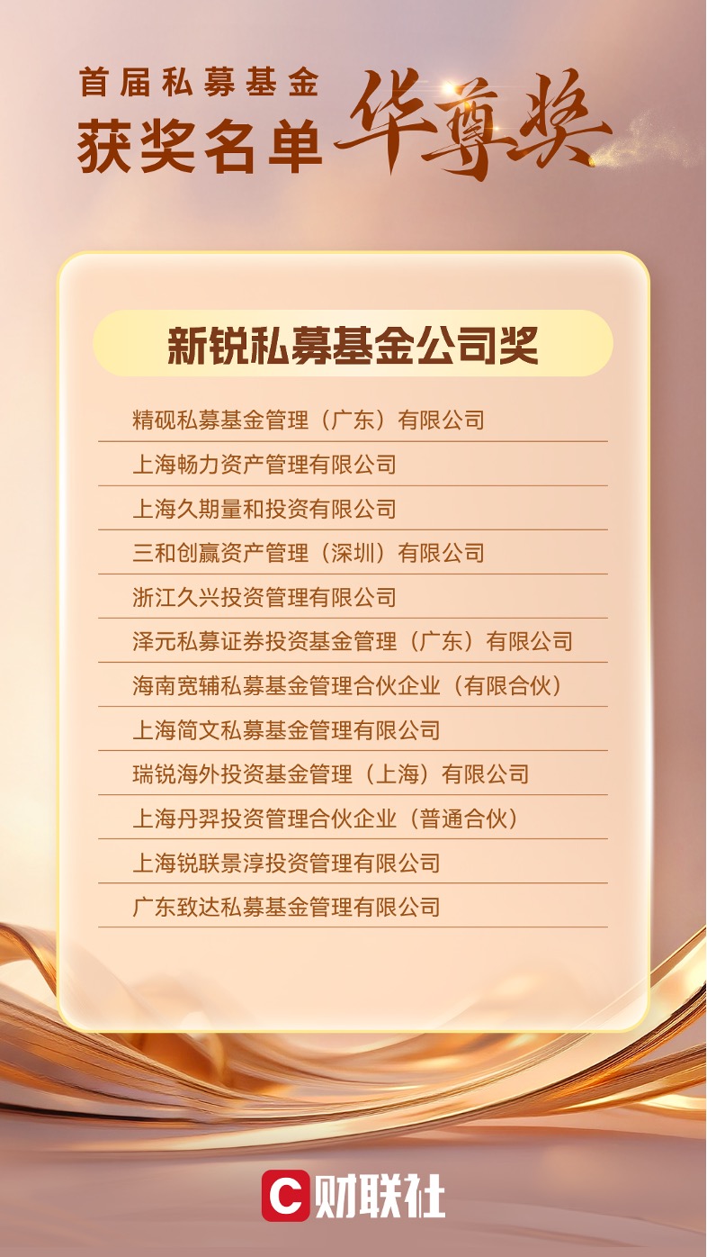 新锐私募基金公司奖:精砚私募基金管理(广东)有限公司、上海畅力资产管理有限公司、上海久期量和投资有限公司、三和创赢资产管理(深圳)有限公司、浙江久兴投资管理有限公司、泽元私募证券投资基金管理(广东)有限公司、海南宽辅私募基金管理合伙企业(有限合伙)、上海简文私募基金管理有限公司、瑞锐海外投资基金管理(上海)有限公司、上海丹羿投资管理合伙企业(普通合伙)、上海锐联景淳投资管理有限公司、广东致达私募基金管理有限公司。