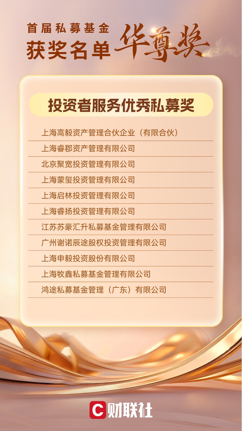 投资者服务优秀私募奖:上海高毅资产管理合伙企业(有限合伙)、上海睿郡资产管理有限公司、北京聚宽投资管理有限公司、上海蒙玺投资管理有限公司、上海启林投资管理有限公司、上海睿扬投资管理有限公司、江苏苏豪汇升私募基金管理有限公司、广州谢诺辰途股权投资管理有限公司、上海申毅投资股份有限公司、上海牧鑫私募基金管理有限公司、鸿途私募基金管理(广东)有限公司。