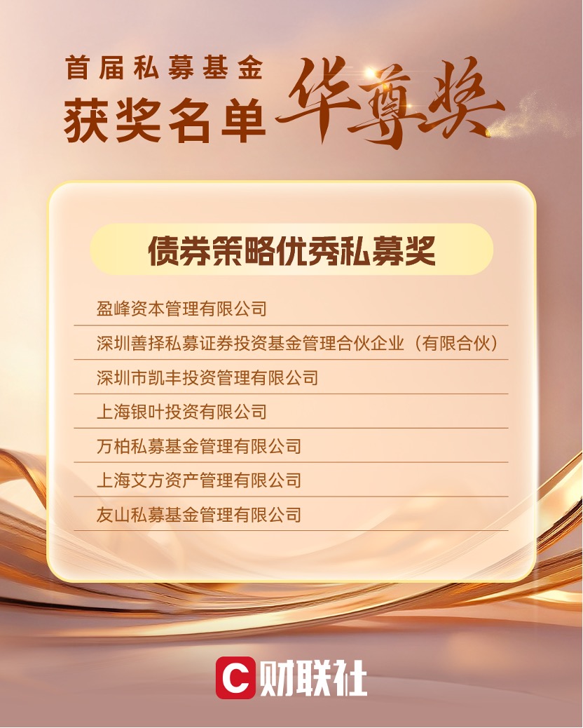 债券策略优秀私募奖:盈峰资本管理有限公司、深圳善择私募证券投资基金管理合伙企业(有限合伙)、深圳市凯丰投资管理有限公司、上海银叶投资有限公司、万柏私募基金管理有限公司、上海艾方资产管理有限公司和友山私募基金管理有限公司。