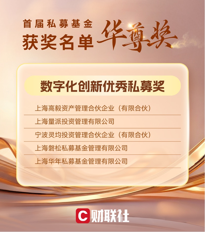 数字化创新优秀私募奖:上海高毅资产管理合伙企业(有限合伙)、上海量派投资管理有限公司、宁波灵均投资管理合伙企业(有限合伙)、上海磐松私募基金管理有限公司、上海华年私募基金管理有限公司。