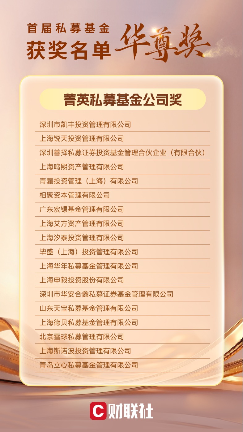 菁英私募基金公司奖:深圳市凯丰投资管理有限公司、上海锐天投资管理有限公司、深圳善择私募证券投资基金管理合伙企业(有限合伙)、上海鸣熙资产管理有限公司、青骊投资管理(上海)有限公司、相聚资本管理有限公司、广东宏锡基金管理有限公司、上海艾方资产管理有限公司、上海汐泰投资管理有限公司、毕盛(上海)投资管理有限公司、上海华年私募基金管理有限公司、上海申毅投资股份有限公司、深圳市华安合鑫私募证券基金管理有限公司、山东天宝私募基金管理有限公司、上海德贝私募基金管理有限公司、北京雪球私募管理有限公司、上海斯诺波投资管理有限公司、青岛立心私募基金管理有限公司。