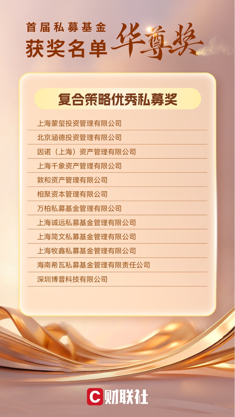 复合策略优秀私募奖:上海蒙玺投资管理有限公司、北京涵德投资管理有限公司、因诺(上海)资产管理有限公司、上海千象资产管理有限公司、敦和资产管理有限公司、相聚资本管理有限公司、万柏私募基金管理有限公司、上海诚远私募基金管理有限公司、上海简文私募基金管理有限公司、上海牧鑫私募基金管理有限公司、海南希瓦私募基金管理有限责任公司、深圳博普科技有限公司。