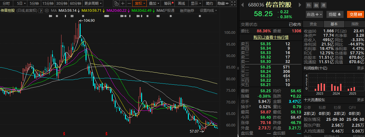 受上述多重因素影响,传音控股业绩已连续多个季度同比下滑。与此同时,该公司股价近期跌幅明显,已从2025年9月25日的104.9元/股高点,跌至今日(2月25日)的收盘价58.25元/股,近五个月跌幅达44.47%。