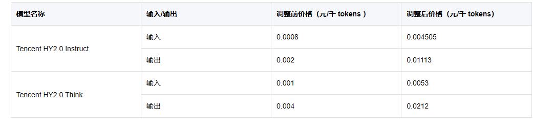 此外,混元系列模型Tencent HY2.0Instruct与Tencent HY2.0Think的价格也将有所调整。其中,Tencent HY2.0Instruct输入价格从每千tokens0.0008元调整为0.004505元,涨幅高达463%;输出价格也从0.002元拉升至0.01113元,涨幅超过456% 。Tencent HY2.0Think输入价格从0.001元调整为0.0053元,输出价格从0.004元调整为0.0212元。