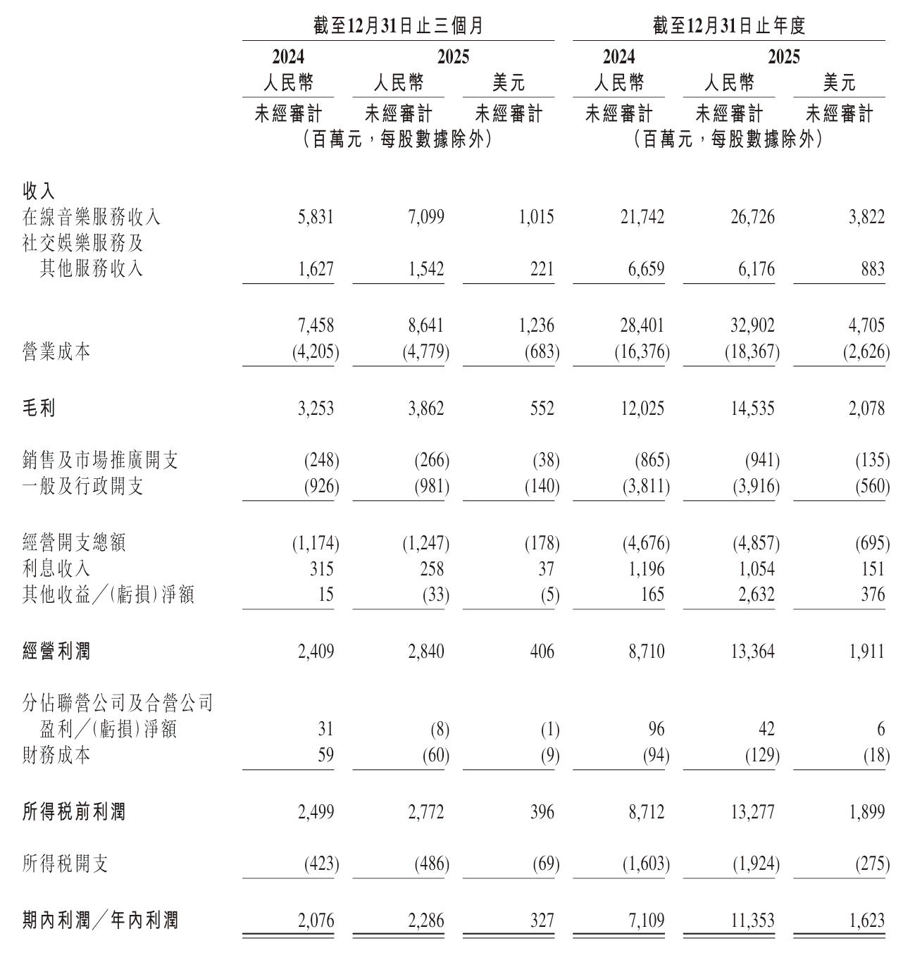 腾讯音乐2025年第四季度及全年业绩报告显示,全年总收入同比增长15.8%至329.0亿元,净利润达113.5亿元;第四季度财务总收入为人民币86.4亿元,同比增长15.9%。