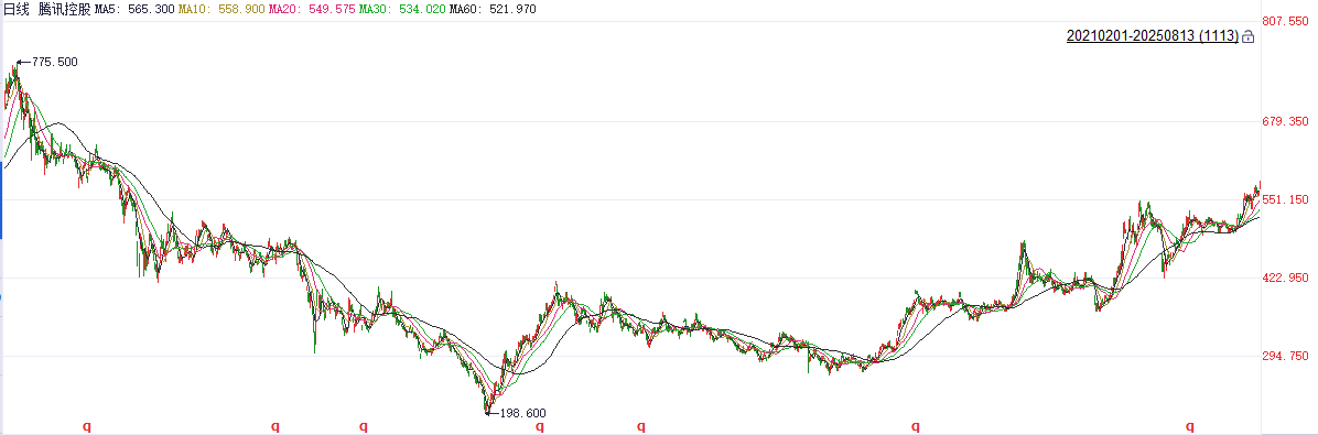 值得注意的是,腾讯在今日盘中一度升至579.50港元,创下自2021年6月30日以来的最佳表现。