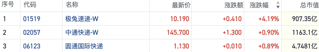 快递业涨价扩围成效初显 港股物流板块走强极兔速递涨超4%