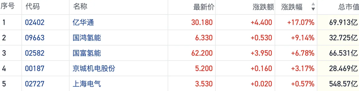 截至发稿,亿华通(02402.HK)涨超17%,国鸿氢能(09663.HK)涨超9%,国富氢能(02582.HK)等个股也纷纷跟涨。