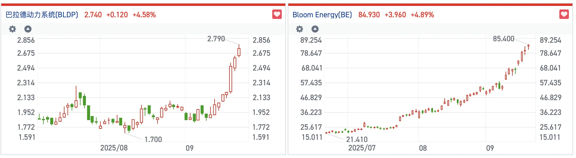 据媒体跟踪报道,今年二季度以来,美股氢能概念股一路狂飙。全球主要的固体氧化物燃料电池(SOFC)供应商之一的Bloom Energy股价半年狂拉逾230%;氢燃料电池系统供应商Ballard股价在过去过去1个月里涨近三成,也令国内相关概念股的短线情绪走高。