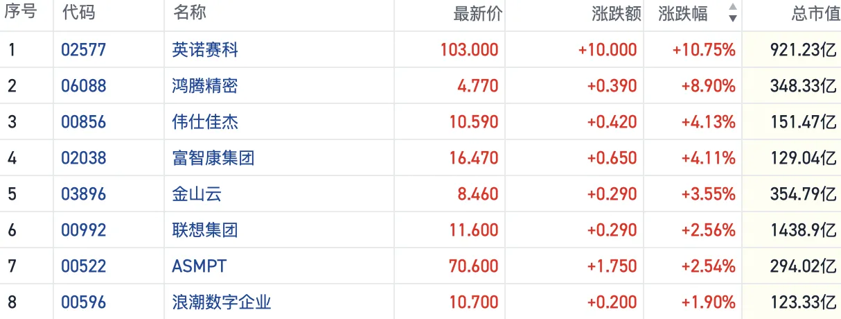截至发稿,英诺赛科(02577.HK)涨近11%,鸿腾精密(06088.HK)涨约9%,金山云(03896.HK)等多家产业链公司也跟涨超3%。