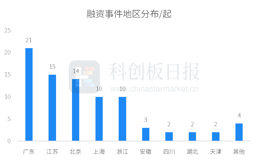 从地区来看,本周广东、江苏、北京、上海、浙江等地公司较受青睐,融资事件数均在10起及以上;广东以21起融资活跃度跃居首位。以单个城市来看,北京、深圳各有14家公司获投,并列第一;上海紧随其后,有10家公司获投。