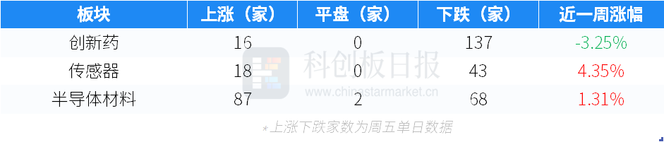 作为对比,本周创新药、传感器、半导体材料二级市场表现如下表所示。