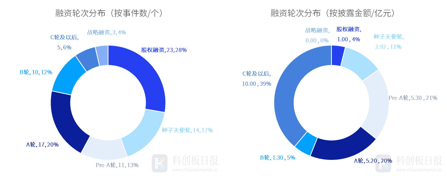 从投资轮次来看,除股权融资外,本周A轮融资事件数最多,发生17起,占比约20%;其次是种子天使轮,发生14起,占比约17%。从各轮次获投金额来看,C轮及以后披露的融资总额最高,约10亿元;其次是Pre-A轮,约5.3亿元。