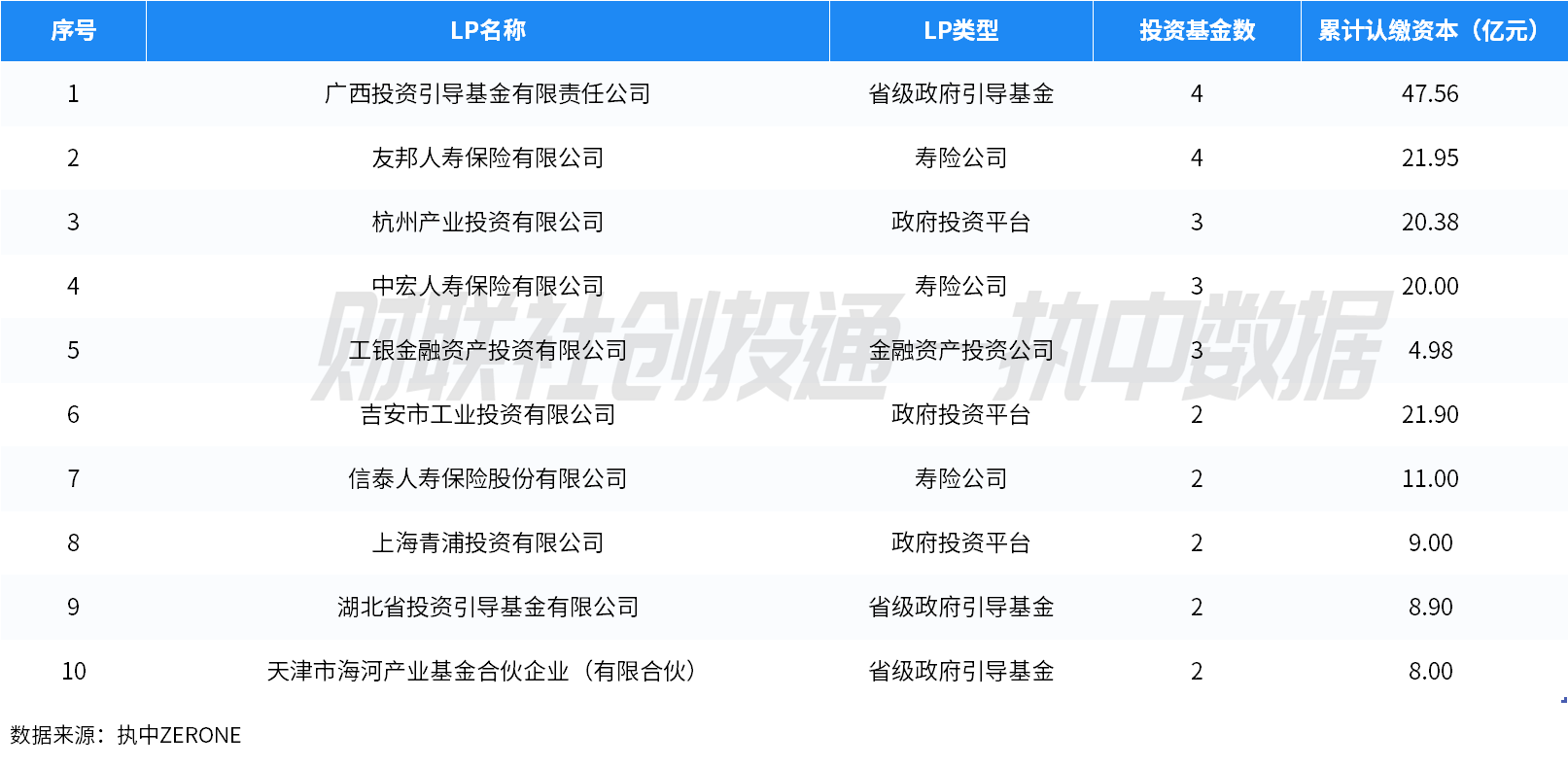 创投通—执中数据显示,9月活跃的机构LP包括广西投资引导基金、杭州产投、吉安市工业投资、上海青浦投资有限公司等政府资金,友邦人寿、中宏保险、信泰人寿等险资机构,以及工银投资等银行系AIC。