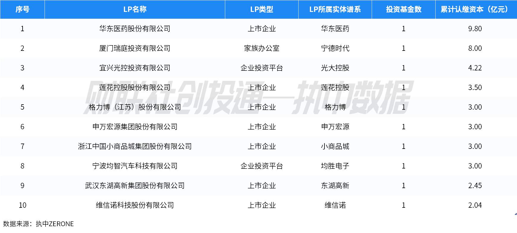 若同时考虑上市公司旗下平台,从上市公司实体谱系视角来看,华东医药、宁德时代、光大控股认缴出资居前三。9月对外认缴资本规模TOP10 LP如下表所示: