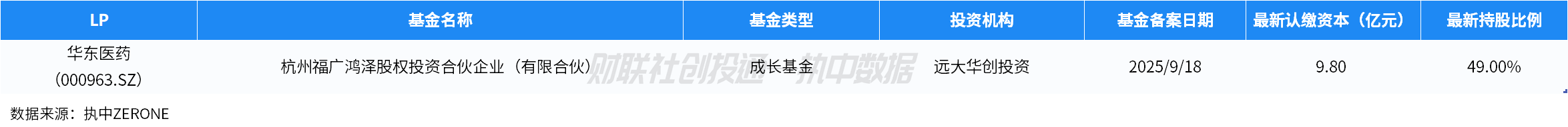 华东医药(000963.SZ)出资参与了远大华创投资管理的杭州福广鸿泽股权投资合伙企业(有限合伙),认缴资本9.8亿元,为9月出资金额最高的上市公司LP。