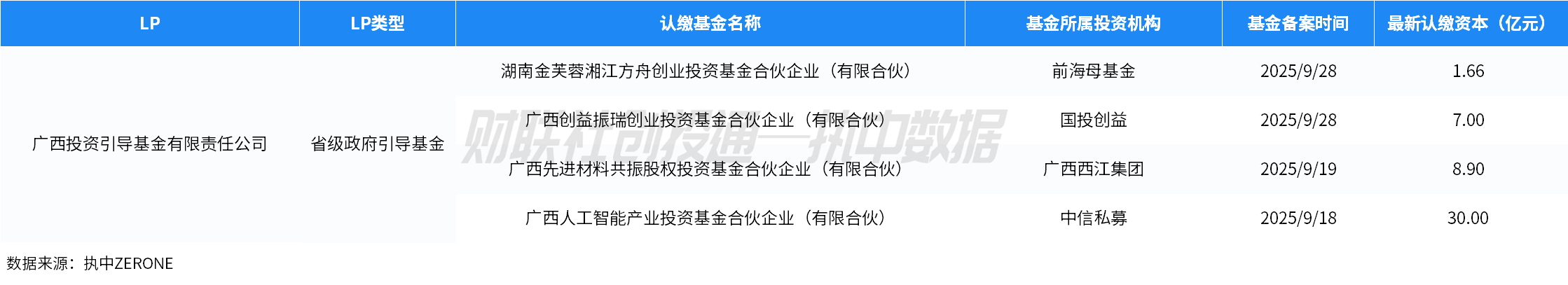 9月最活跃的政府资金LP为广西投资引导基金有限责任公司,出资参与的4支基金完成备案,出资规模也最高,累计认缴资本约47.56亿元。