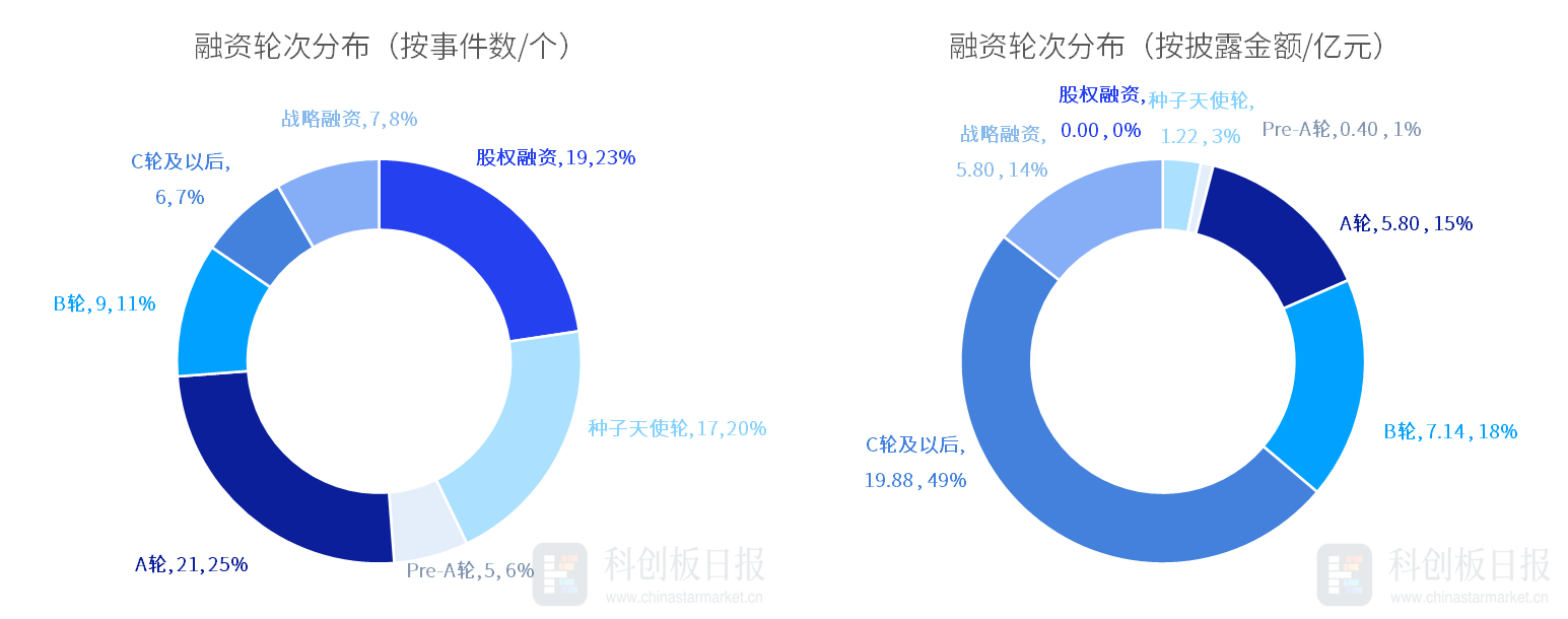 从投资轮次来看,除股权融资外,本周A轮融资事件数最多,发生21起,占比约25%;其次是种子天使轮,发生17起,占比约20%。从各轮次获投金额来看,C轮及以后披露的融资总额最高,约19.88亿元;其次是B轮,约7.14亿元。