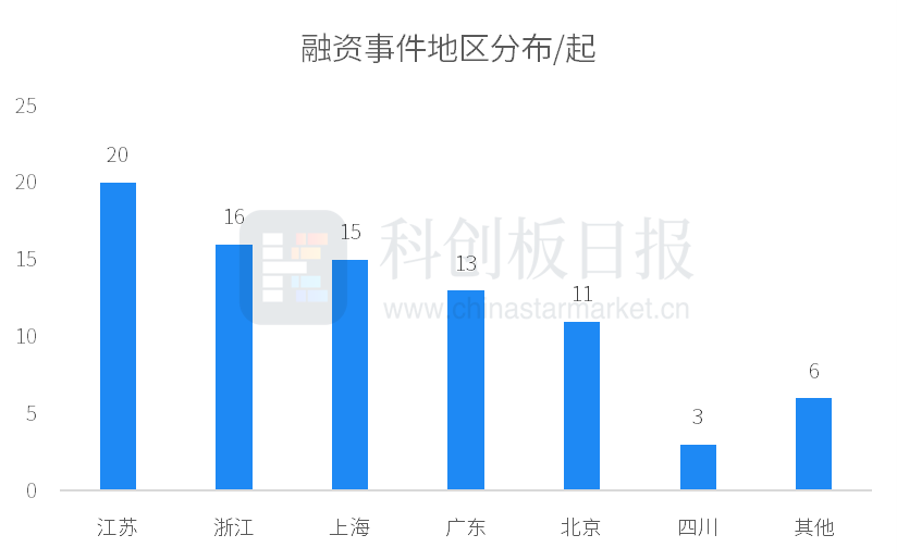 从地区来看,本周江苏、浙江、上海、广东、北京等地公司较受青睐,融资事件数均在10起以上;江苏以20起融资活跃度继续领先。以单个城市来看,上海有15家公司获投,居首位;北京紧随其后,有11家公司获投。
