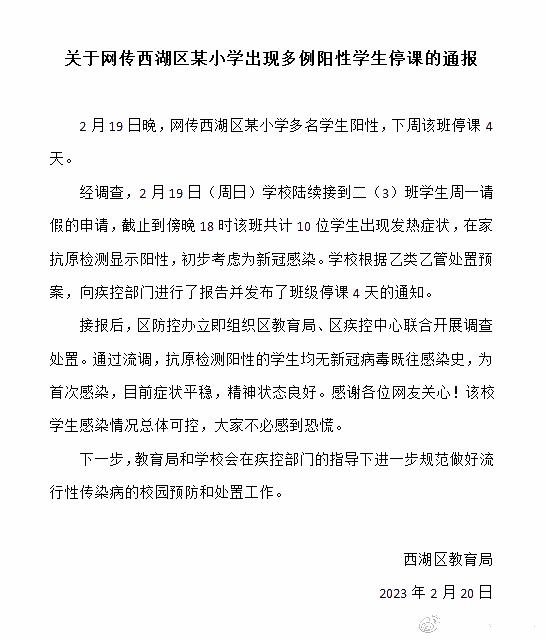 【杭州西湖区教育局:一小学10名学生新冠抗原阳性 班级停课4天】财联社2月20日电,杭州市西湖区教育局发布关于网传西湖区某小学出现多例阳性学生停课的通报:经调查,2月19日(周日)学校陆续接到二(3)班学生周一请假的申请,截止到傍晚18时该班共计10位学生出现发热症状,在家抗原检测显示阳性,初步考虑为新冠感染。学校根据乙类乙管处置预案,向疾控部门进行了报告并发布了班级停课4天的通知。接报后,区防控办立即组织区教育局、区疾控中心联合开展调查处置。通过流调,抗原检测阳性的学生均无新冠病毒既往感染史,