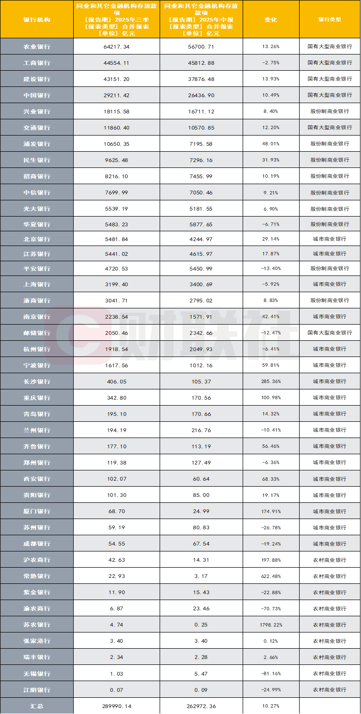 据Wind数据统计,以42家上市银行财报数据来看,2025年三季度末同业存放规模达29万亿,较年中26.30万亿规模单季增长10.27%。其中中小银行增速普遍较快,不少单季增幅超100%,长沙银行、厦门银行、重庆银行等城商行单季增幅分别达到285.36%、174.91%、100.98%,苏农银行、常熟银行等农商行同业存款增幅甚至达到1798.22%和622.48%,背后折射出部分中小银行核心存款增长乏力,对同业负债的依赖度大幅攀升。