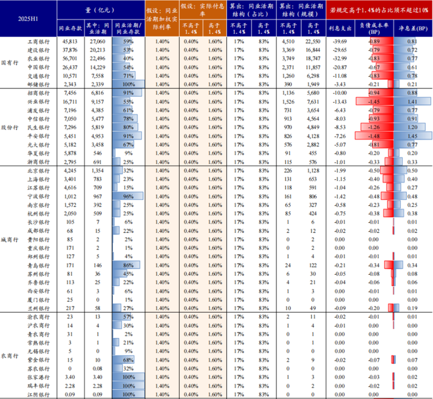 目前,银行同业活期存款利率高于1.4%的金额数据不可得,部分券商研究团队对上市银行相关数据进行了测算。