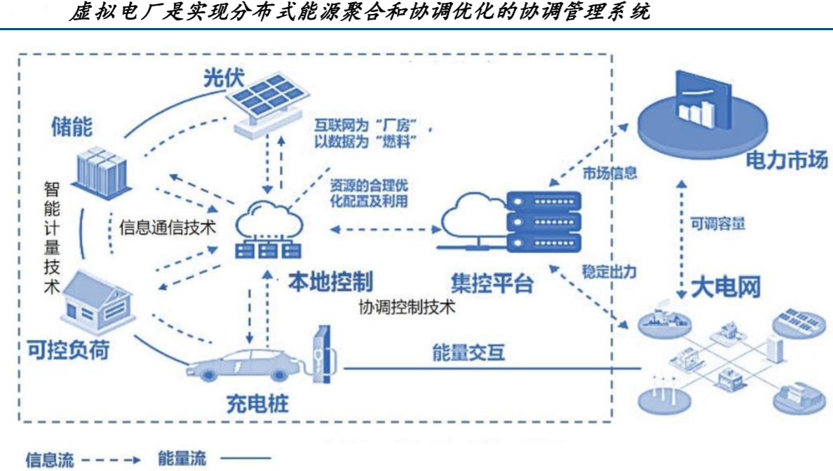 虚拟电厂本质上是一套软件平台系统,通过先进信息通信技术和软件系统,实现分布式电源、储能系统、可控负荷、电动汽车等分布式能源资源的聚合和协调优化,以作为一个特殊电厂参与电力市场和电网运行的电源协调管理系统,为配电网和输电网提供管理和辅助服务。