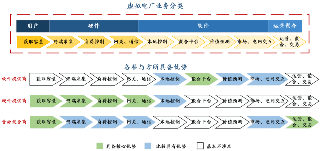 虚拟电厂业务大致划分为三类:软件平台类、硬件类、运营聚合类。其中软件平台涉及到:①本地控制、②聚合平台、③价值预测优化、④市场和电网交互四大模块;硬件包括:①终端采集设备(智能电表等)、②负荷控制终端、③网关和通信三种。