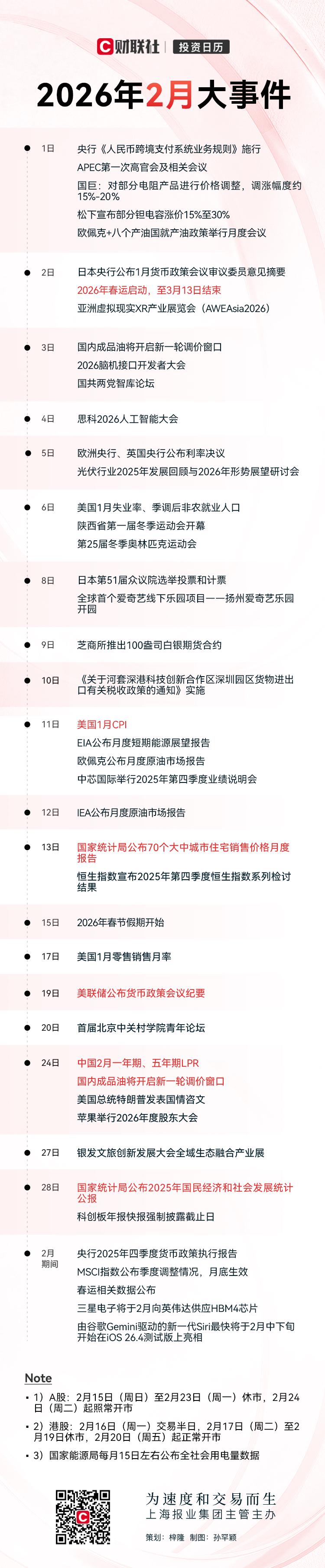 【投资日历:周五资本市场大事提醒】 ①今日暂无新股申购。 ②第25届冬季奥林匹克运动会将于2月6日至22日在意大利举行。 ③陕西省第一届冬季运动会将于2月6日开幕。 ④千问APP宣布投入30亿启动“春节请客计划”,将于2月6日正式上线。 ⑤牧原股份、大族数控H股将于2月6日在香港联交所主板挂牌并开始上市交易。 ⑥因美国政府停摆,原定于本周五(2月6日)发布的美国1月非农就业报告将不会如期公布。 ⑦今日有4775亿元7天期逆回购到期。 ⑧今日将公布美国2月密歇根大学消费者信心指数等数据。