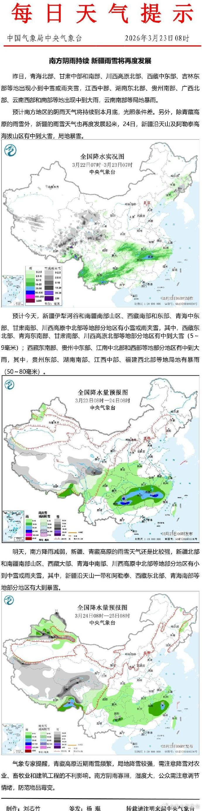 【中央气象台:预计南方地区的阴雨天气将持续到本月底】财联社3月23日电,据中央气象台23日消息,预计南方地区的阴雨天气将持续到本月底,光照条件差。另外,除青藏高原的雨雪外,新疆的雨雪天气也再度发展起来,24日,新疆沿天山及阿勒泰高海拔山区有中到大雪,局地暴雪。气象专家提醒,青藏高原近期雨雪频繁,局地降雪较强,需注意降雪对农业、畜牧业和建筑工程的不利影响。南方阴雨寡照,湿度大,公众需注意调节情绪,防范物品霉变。