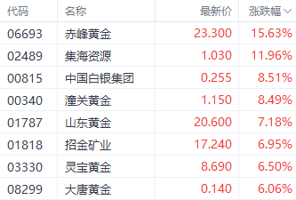 在现货黄金价格持续攀升的推动下,港股黄金股延续强势表现。截至发稿,赤峰黄金(06693.HK)、潼关黄金(00340.HK)、山东黄金(01787.HK)、招金黄金(01818.HK)分别上涨15.63%、8.49%、7.18%、6.95%。