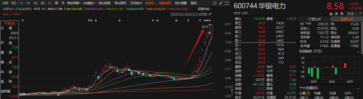 具体来看,华银电力以最高超44倍的业绩增速依旧遥遥领先,公司预计2025年半年度实现归属于母公司所有者的净利润1.8亿-2.2亿元(未经审计),与上年同期相比将增加1.75亿-2.15亿元。(具体详见财联社此前深度报道:A股中报行情纵深推进 15家上市公司净利最高同比预增超90%)二级市场方面,7月迄今公司股价累计最大涨幅达93.13%。