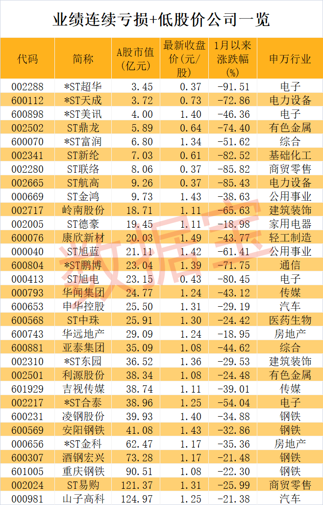 据数据宝统计,在上半年净利润亏损的众多上市公司中,2022年、2023年净利润均为亏损状态,且最新收盘价不足1.5元/股的公司有31家。这些公司中,9家A股市值低于10亿元,如*ST超华、*ST天成、*ST美讯、ST鼎龙、*ST富润等。
