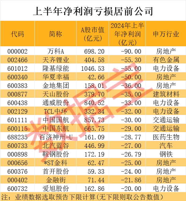 地产龙头万科A预计上半年净利润亏损70亿元至90亿元,亏损金额将创上市以来同期新高,也是当前半年报业绩亏损最高的公司。公司亏损具体原因包括:房地产开发项目结算规模和毛利率显著下降、公司对部分项目计提了减值、部分非主业财务投资出现亏损、部分大宗资产交易和股权交易价格低于账面值。