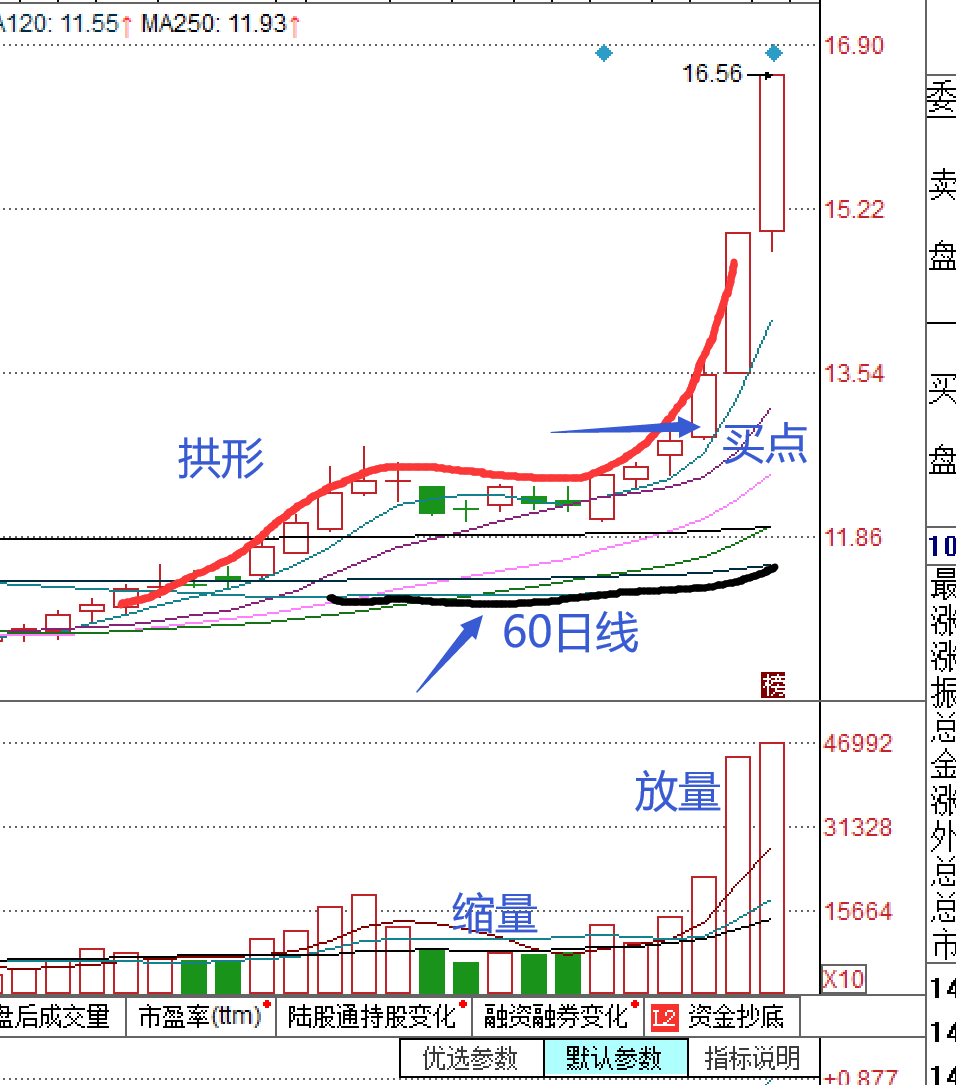 3、【60日均线】:美人肩形态的日K线必须要在60日均线上方运行,而且60日线最好是悬空的,这表明这种形态是强势特征。